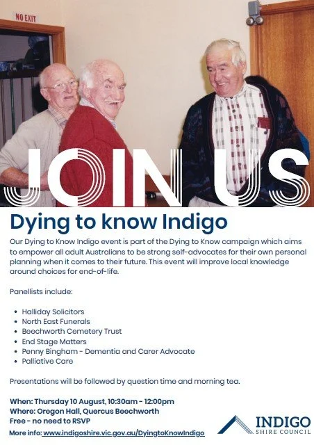 Our Dying to Know Indigo event is part of the Dying to Know campaign which aims to empower all adult Australians to be strong self-advocates for their own personal planning when it comes to their future. This event will improve local knowledge around choices for end-of-life.